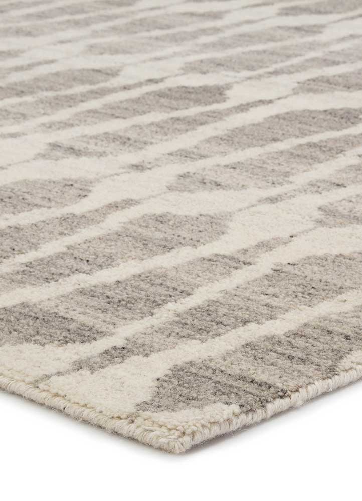 Artisan hand-knotted area rug, featuring a bold pattern. 100% wool construction in a light grey and ivory color pallet. Hand-made in India