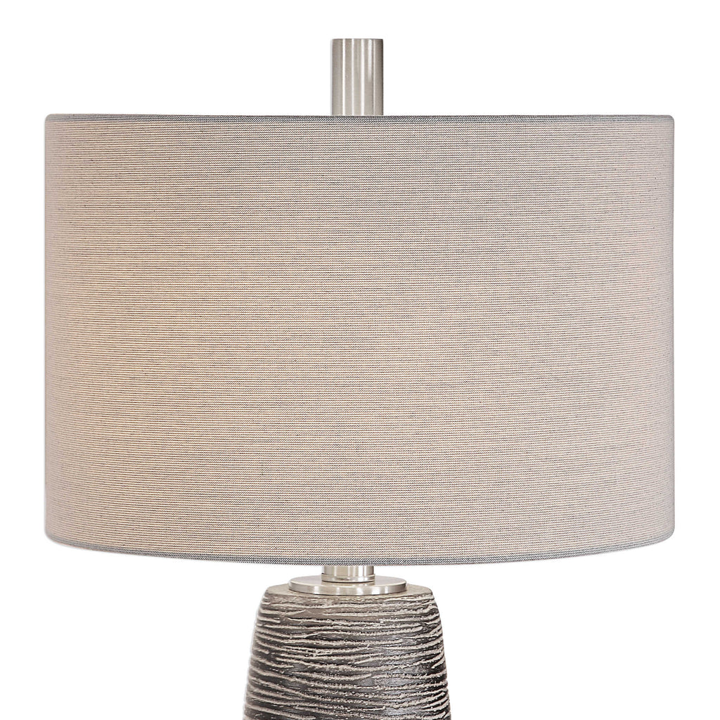 Ceramic base, heavily textured in a rustic bronze tone with light grey accents. Brushed nickel plated hardware. Round hardback shade in a beige linen fabric. 3-way socket switch. 150W max. UL listed. Imported