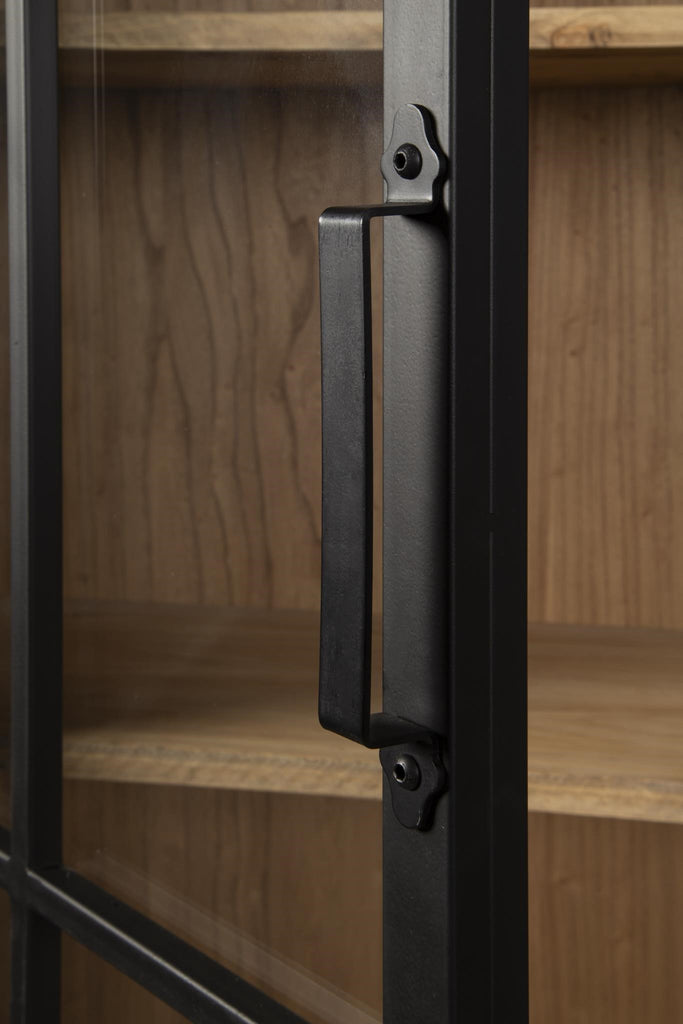 Individually crafted from reclaimed pine in an antiqued natural finish. Cast iron doors and base in matte black. Imported.