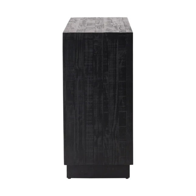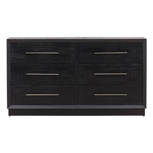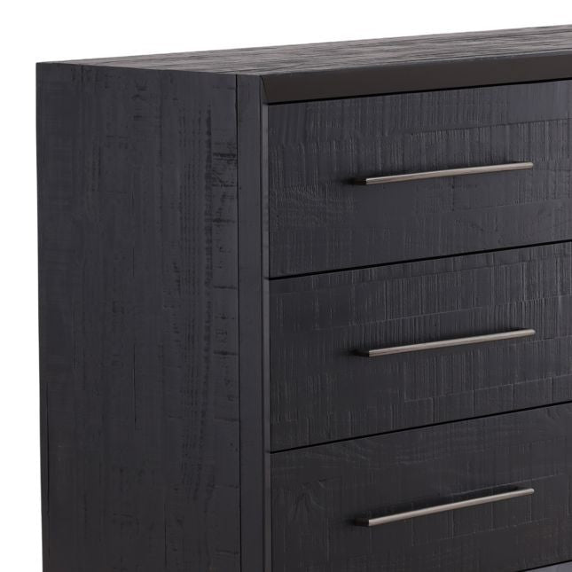 Crafted from reclaimed pine in a modern black paint with nickel handles. Drawers on extension glides. Imported