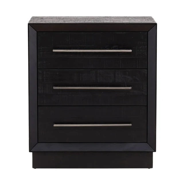 Crafted from reclaimed pine in a modern black paint with nickel handles. Drawers on extension glides. Imported