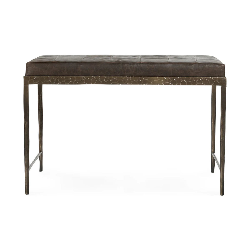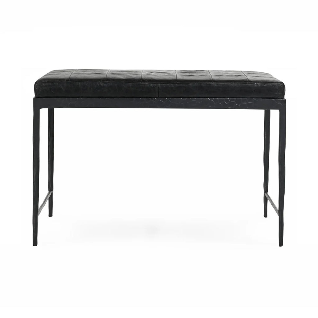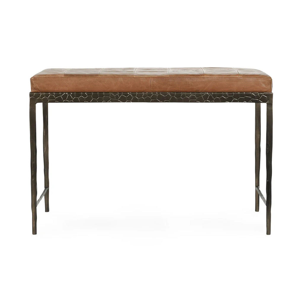 The Loma bench features a luxurious top grain leather seat cushion and a hammered cast iron base. Ideal for any space that calls for a omfortable place to sit and an eye-catching design accent. Availabe in black, cocoa, and brown. Imported