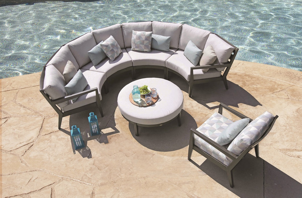 The luxurious and timeless Lucia collection is scrupulously crafted from hand-brushed, durable and weather-proof powder-coated aluminum in an ash grey finish. Weather-resistant reticulate foam cushions upholstered in outdoor Sunbrella fabrics assure years of enjoyment and ease of maintenance. Imported