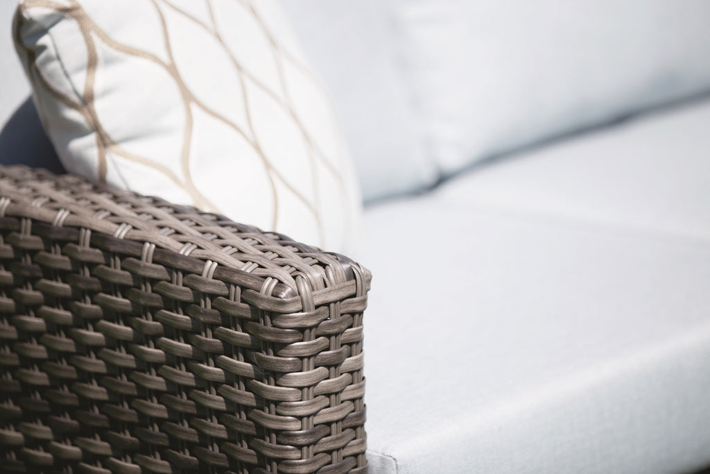 Thick durable resin weave in an espresso finish resembles wicker weaving. Powder-coated aluminum frames provide strength and durability for any weather condition. Cushions are specifically engineered for outdoor use and covered in a wide selection of weather and fade-resistant outdoor fabrics. Imported.