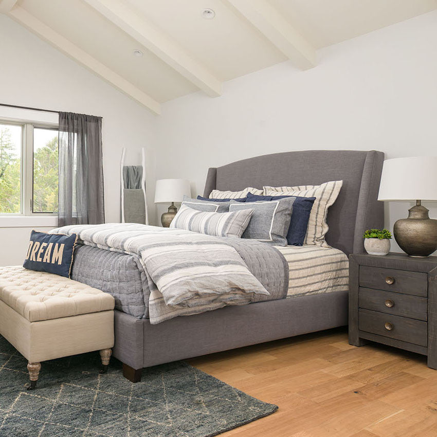 Manufactured in Southern California. Alder, pine, and plywood construction. Double-bolted corner brackets on rails coupled with center-supported slats provide tremendous strength and durability. This bed frame comes standard with a platform to allow for use with or without a boxspring. Available in expansive fabric selection and choice of nailheads.