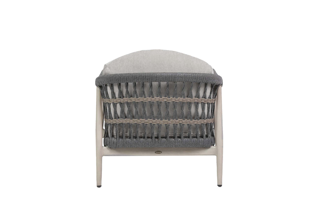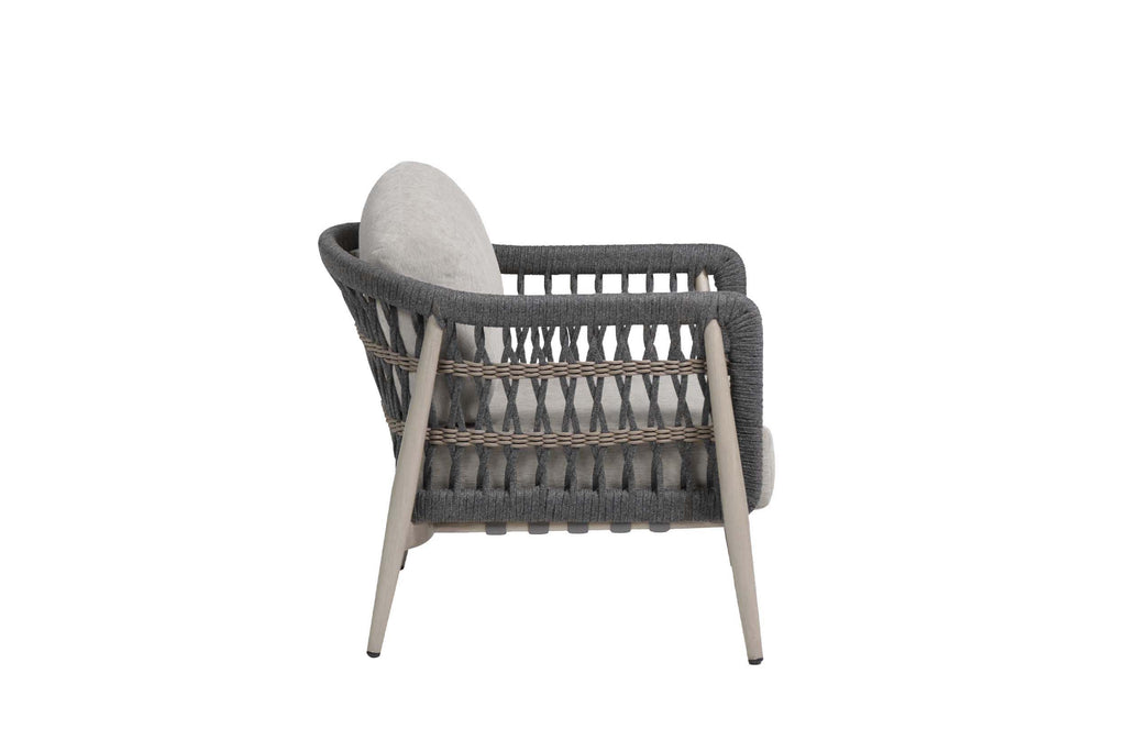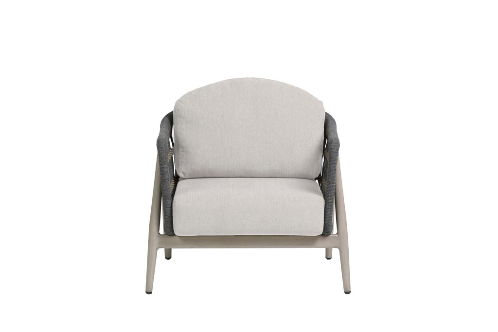 Intricately hand-woven UV resistant polyolefin ropes over hand-brushed weather-proof, powder-coated aluminum frames define this Florida-inspired collection. Cushy, rounded cushions in weather-resilient Sunbrella fabrics add ultimate comfort. Imported.