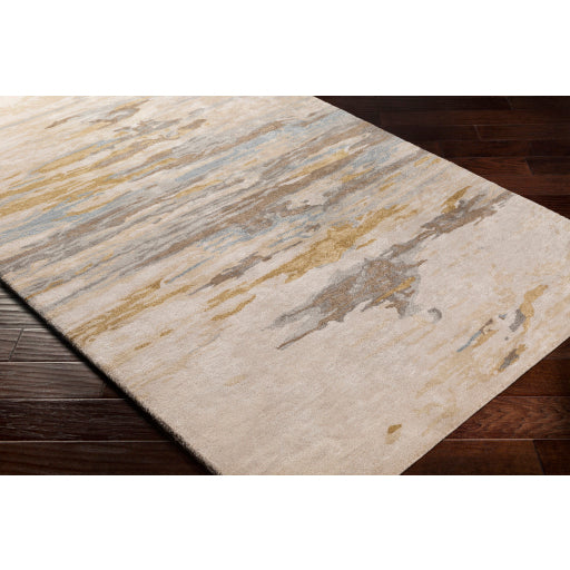 Machine-woven area rug. Crafted from durable and resilient 70% viscose and 30% acrylic. Low 0.31" pile. Charcoal, gray, light gray, and mustard colorways. Made in Turkey