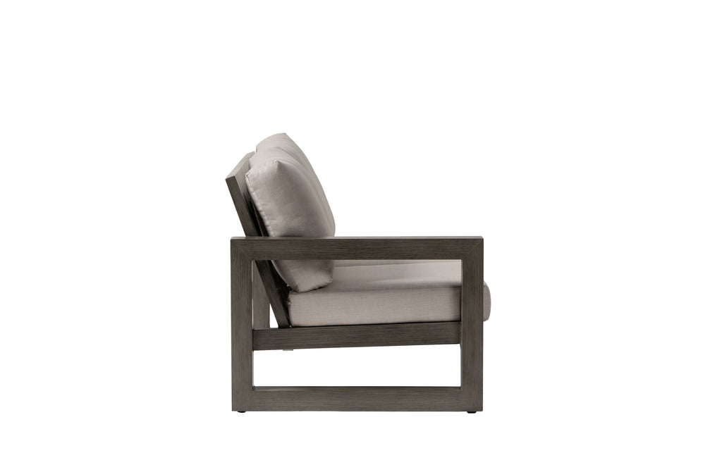 Contemporary, elegant lines define this inviting and timeless outdoor collection. Crafted exclusively from light-weight aluminum to provide rust-free weather-resilience and movability. Hand-brushed ash grey finish. Weather-resistant reticulate foam seat cushions upholstered in outdoor Sunbrella fabrics assure a long-lasting product and easy maintenance. Imported