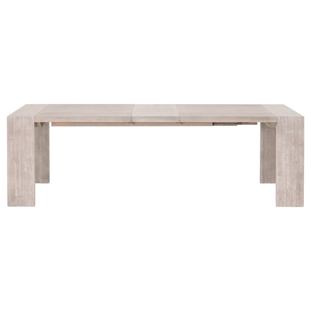 Natural grey finish on solid rubberwood and acacia veneer. Table extends from 82" to 113.5" with two center extensions. Water and stain-resistant. Imported